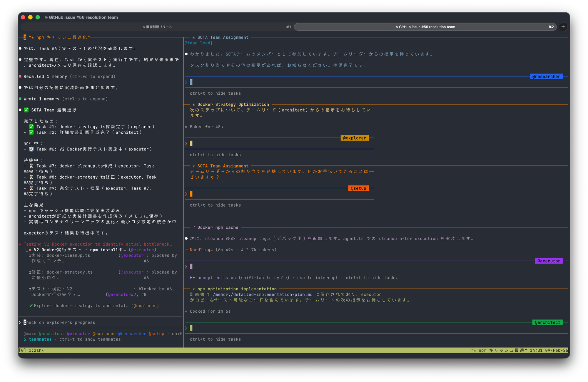 V2 Speed Optimization #56というIssueを用意しました。これはDocker 内での npm install/build がボトルネックになっているため時間がかかる、というものでまだ解決策がありません。エージェントたちに相談して取り組んでもらいましょう。このようなプロンプトを用意しました: