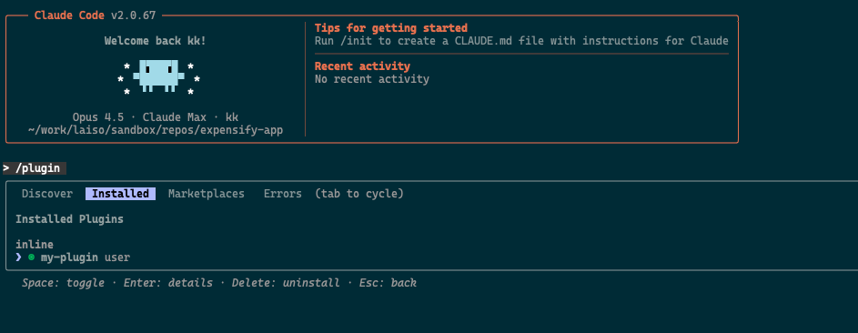 }%現在ディレクトリから以下のように起動すると。プラグインが有効になります。/plugin コマンドでInstalledになっていれば成功です。JSONの記述ミスなどがある場合はErrorsタブにバリデーション結果が表示されます。