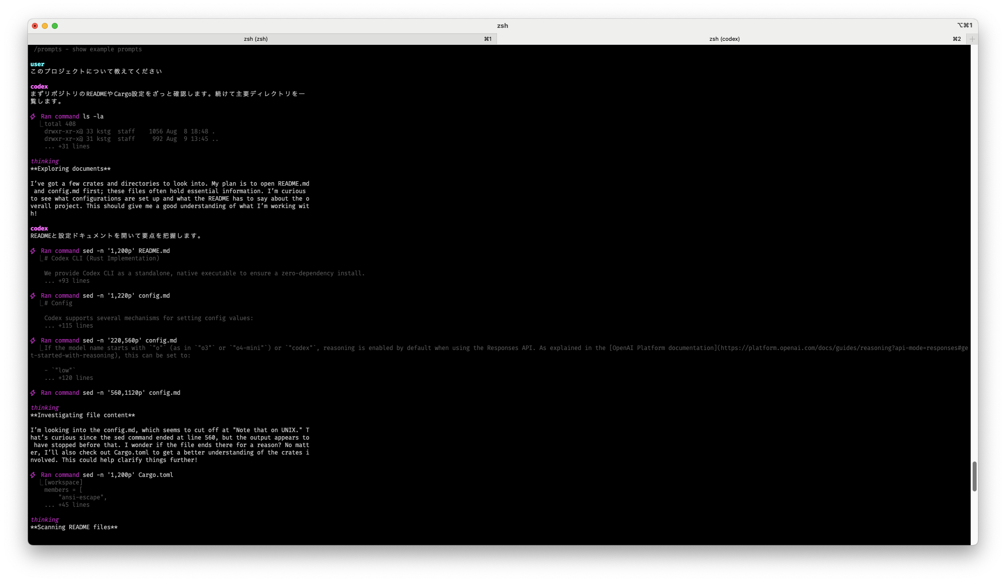 codexデフォルトのgpt-5は返答の前に内部で思考した内容を出力します。これがthinkingとして表示されます。ここはモデルのネイティブ言語の英語のままになります。