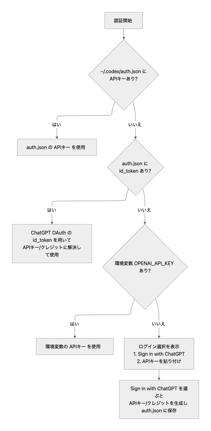 }シェル上でOPENAI_API_KEYを上書きしてcodexを実行しても、auth.jsonが存在すると優先されます。フロー図にすると以下になります。