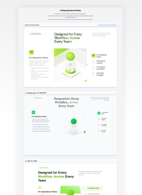 Claude Opus 4.5が依然としてUI再現度においてトップを維持しています。Gemini 3 ProやGPT-5.1 Codexも悪くはないですが、安定性という点でOpusには一歩及ばない、というのが筆者の印象です。