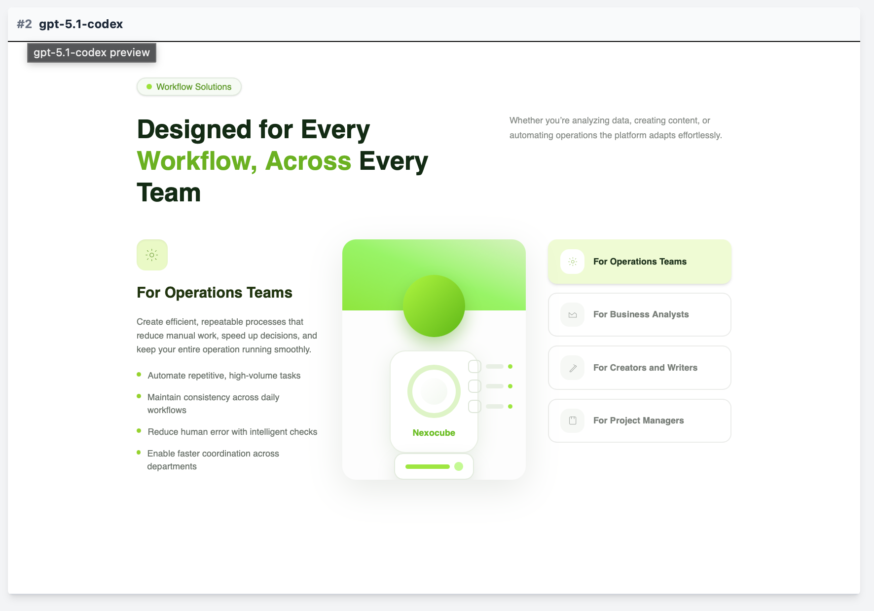 OpenAIのCodex系は「慎重で防御的なコード」を出すことで知られています。エッジケースを考慮した堅牢な実装、エラーハンドリングの丁寧さ——そうした美点はあるのですが、レイアウトの整合性という点では崩れやすい傾向がありました。