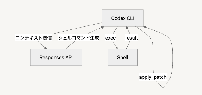 Codex CLIは、ユーザーの指示に基づき、ローカル環境からコンテキスト(指示+プロンプト)を生成してOpenAIのResponses APIに送信します。これを使ってFunction Callingを通じ、受け取った情報からシェルコマンドを実行するという基本設計です。Claude CodeやGooseのようなMCPクライアント/サーバー分離アーキテクチャと比べると、より簡易的ですね。ただし、入力に対してシェルコマンドのみを実行する制約は、意図的なデザインだと著者は考えます。