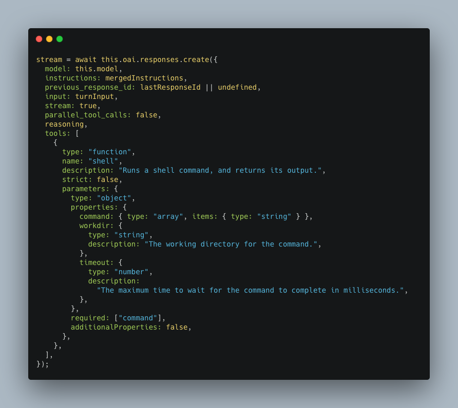 それよりは、Codex CLIでは、LLMが推論を必要とするFunction Callingが「shell関数のみで実現されている」のが注目するところです。