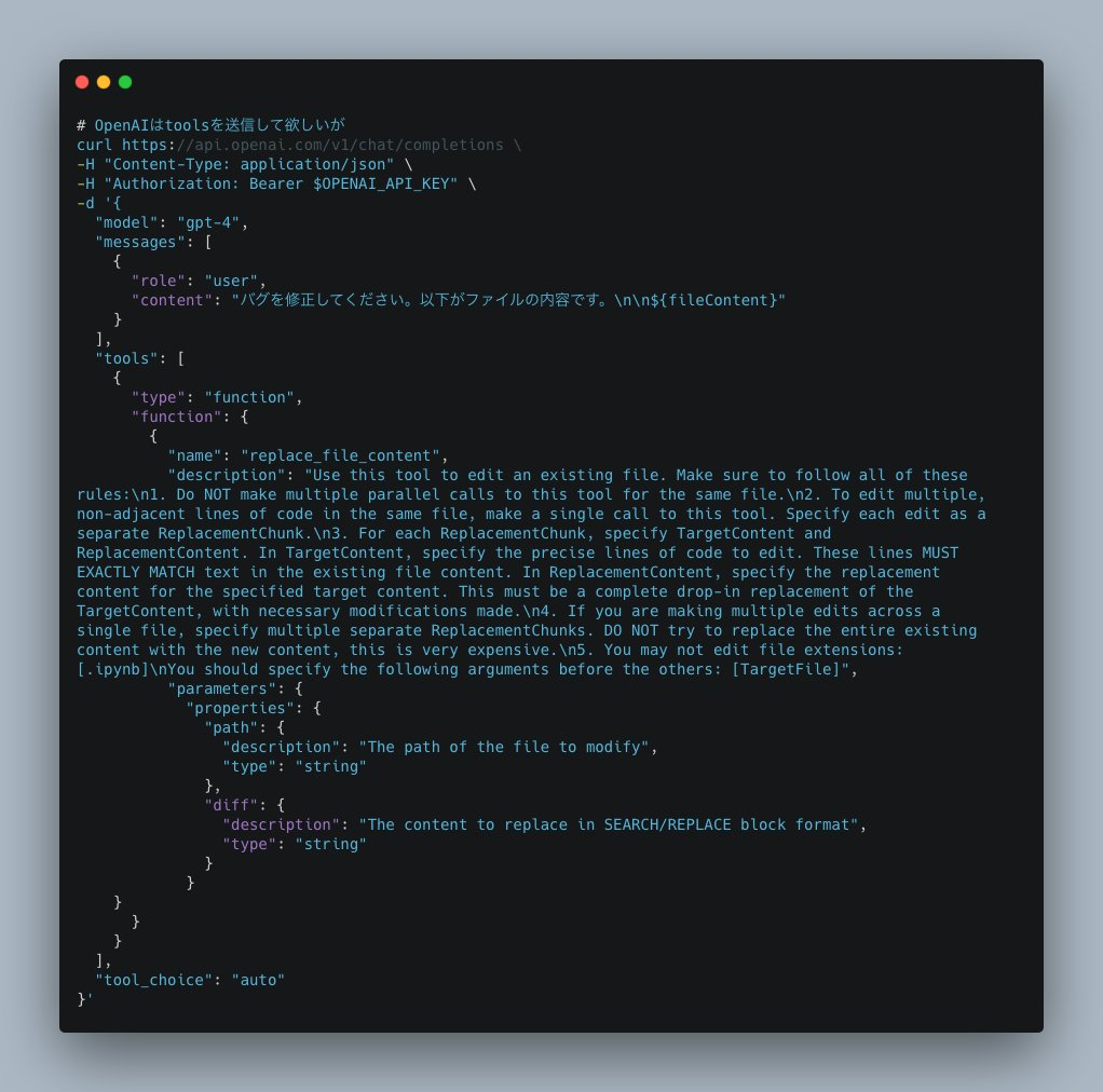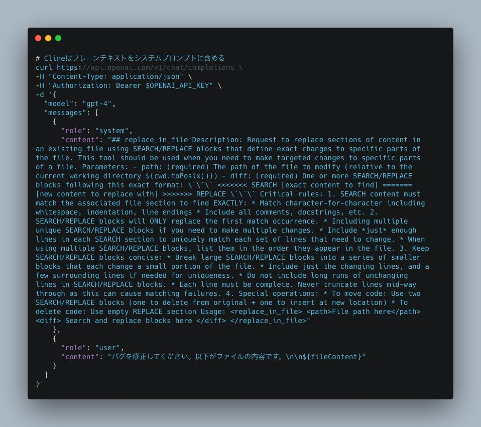 またClineで機能するClaude系のプロンプトはプレーンテキストにXMLで表現したパラメータを埋め込み、レスポンスでパースします。おそらくGeminiもこの方式に適合しているはずです。