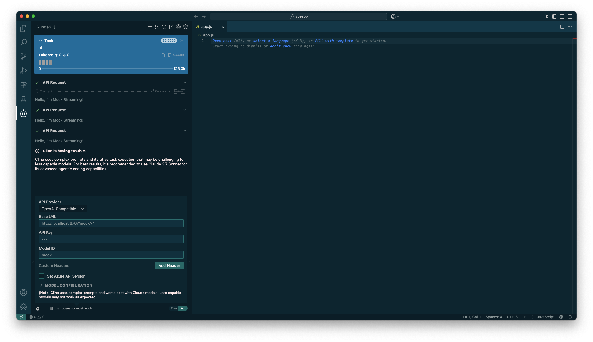 これを先ほどのモックAPIのエンドポイントと入れ替え http://localhost:8787/openai/v1 にモデルIDをgpt-4o などに指定するといつものClineのように動作します。ただここまでだとリクエストをそのまま流して何が嬉しいのか? と思いますよね。次の段階ではv0 APIのように前処理工程を加えてゆきます。
