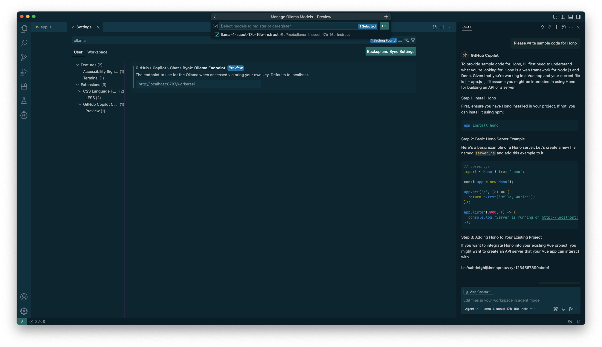 また、GitHub Copilot Chatはv1.99以降でOllamaエンドポイント設定に対応しており、Ollamaのモデル情報を返すエンドポイントの追加が必要ですがClineと同じく動作します。こちらはローカルホストのAPIを想定した機能のためAPIキー設定は不要です。