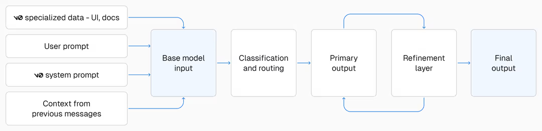 v0モデルは内部でClaude(Anthropic Sonnet 3.7やSonnet 4)などの既存のLLMのAPIを呼び出し、それらの結果を活用する仕組みになっています。Vercelはこのアプローチを複合モデルアーキテクチャ(Composite Model Architecture)と呼んでいます。