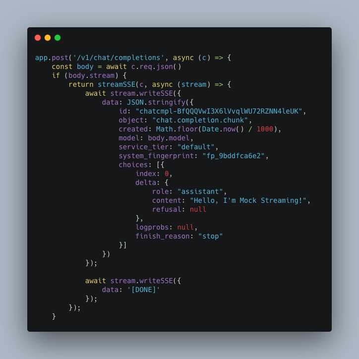 モックレスポンス版(mock.ts)は単に"Hello, I'm Mock Streaming!"という返事のみの固定のJSONデータをストリーミングで返します。HonoのAPIによって以下のように簡単に書けますね。