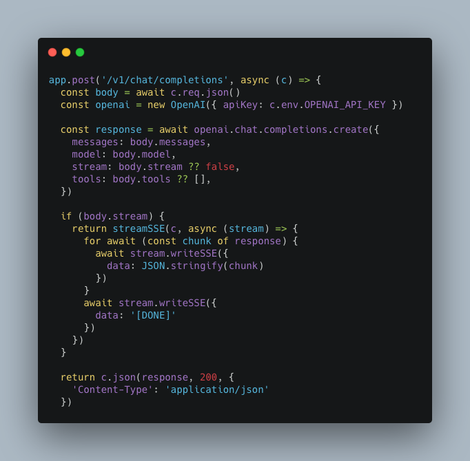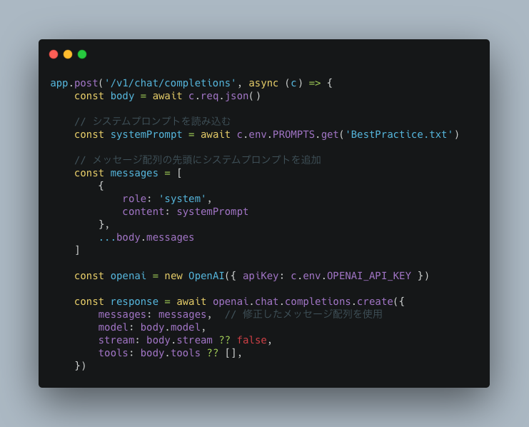 次にOpenAI版(openai.ts)です。差分は単に入力→出力をそのままOpenAIのSDKに渡すだけで、完全なプロキシサーバーになります。