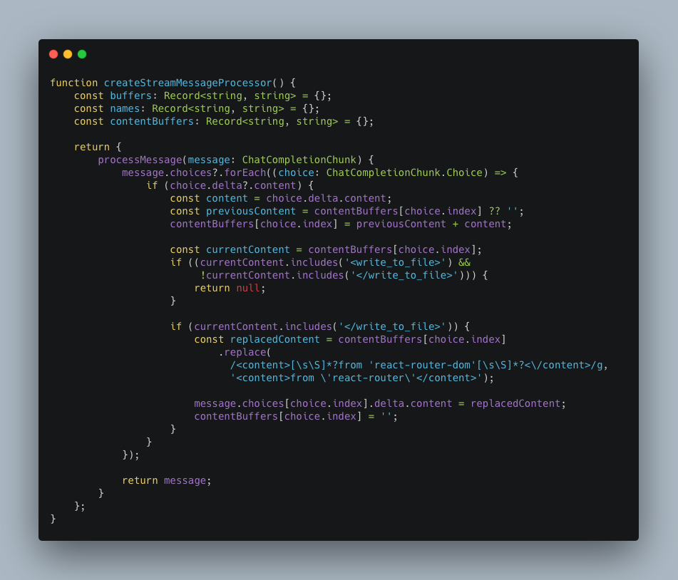 生成されたコードをユーザーに返却する前に、ストリーミングレスポンスのチャンクを書き換えることで、AIエディタの挙動を動的に制御できます。