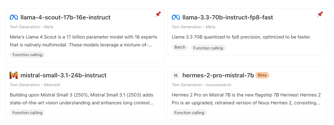 モデルの選択については、Workers AIで現在Function Calling(tools)に対応したモデルはいくつかあり、その中でもllama-4-scout-17b-16e-instructが最も忠実にツール呼び出しの応答がされることを確認しました。