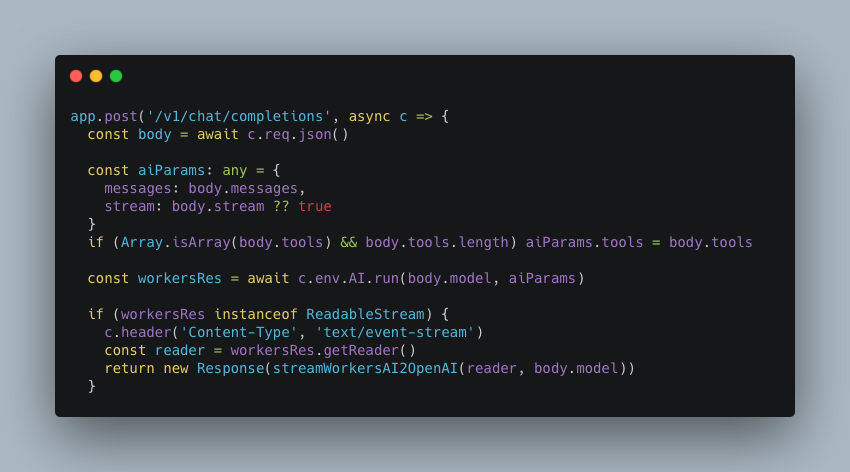 v0 APIの複合モデルアーキテクチャは、内部で呼び出すLLMを動的に切り替える仕組みを備えています。これと同様の機能を実現するため、先ほど実装したOpenAI APIの呼び出し部分をCloudflareのWorkers AIに置き換えてみます。