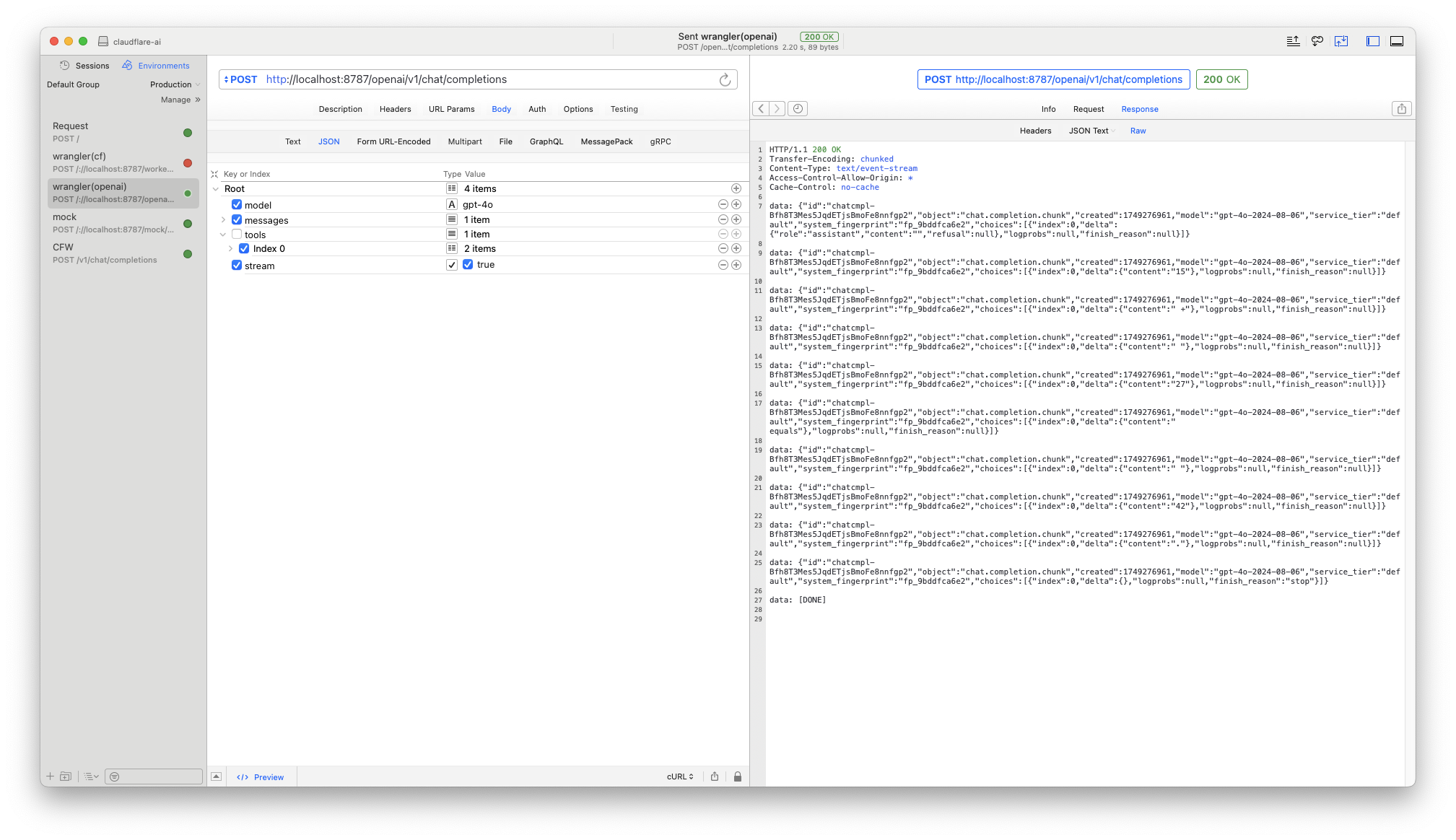 streamWorkersAI2OpenAI の工程はかなり骨が折れる作業でした。基本的にデータ構造の移し替えなのですが、Workers AIのレスポンス仕様→OpenAIのレスポンス仕様→Clineのクライアント仕様の階層を辿るのでデバッグを人間が真心を込めて行う必要がありました。筆者はHTTPクライアントツールなどを駆使して各リクエストの中身の値を観察してロジックを組みました。
